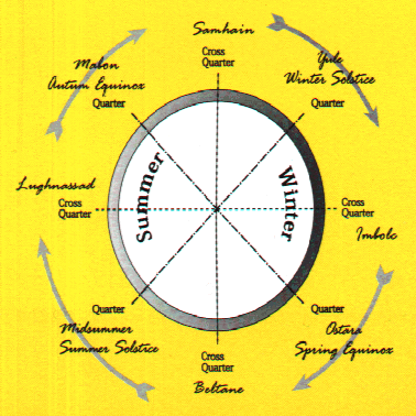 Yule: Sunset December 21 (midnight December 22 Stonehenge time) is the sabbat Yule, The Winter Solstice. When the Wheel of the Year turns to Yule, the Wiccan God (who died at Samhain, October 31) is reborn of the fertile Goddess. During Yule the Wiccan Goddess and the reborn Wiccan God are reunited. At the Imbolg sabbat they will conceive the son who becomes the reborn Wiccan God at next year's Yule sabbat.